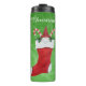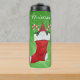 Cette bouteille thermale tumbler pour garder vos boissons froides ou chaudes est verte avec des tourbillons fantaisistes et un gnome avec une barbe blanche à l'intérieur d'un stock de Noël rouge et blanc avec des sucres de canne et des feuilles saints. Customisez votre nom avec le modèle.