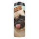 Carlin chien avec langue et biscuits sur la tête, arrière - plan vert.