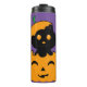 Termo para halloween de Gato negro en una calabaza, colores morado, negro y naranja.