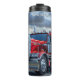 Cette image présente un semi-camion rouge vif aux accents chromés, conduisant sur une route entourée de montagnes enneigées sous un ciel nuageux et spectaculaire. La route semble humide et réfléchissante, et la scène générale véhicule une présence puissante contre un paysage accidenté.
