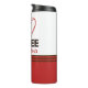This personalized tumbler features the phrase “I ♥ Coffee” with letters filled with a coffee bean pattern and space for a custom name.