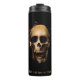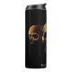 Trois crânes humains sur fond de noir, Une petite créature regardant au-dessus du crâne moyen