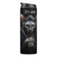Custom Grim Reaper Sphynx cat skeleton thermal travel tumbler. Featuring a realistic Sphynx cat grim reaper in a black hooded robe with skeleton hands holding a scythe. Personalization options to add name, text or upload a photo to create your own custom Sphynx Cat candle gift for hairless cat lovers, for any occasion.