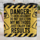 Ce panneau d'avertissement audacieux et humoristique comporte "DANGER :" au-dessus d'un arrière - plan jaune en détresse avec des rayures de danger noires. Le message affirmé : "POUR ÉVITER L'ARGUMENT / NE PAS REMETTRE EN QUESTION / MES MÉTHODES / SIMPLEMENT PROFITER DES / RÉSULTATS" en lettres noires. Les triangles d'avertissement crâne et point d'exclamation renforcent son attrait sournois et irréfléchi.
