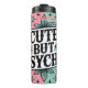 Ce design graphique présente l'expression "CUTE BUT PSYCHO" en caractères gras. L'arrière - plan est divisé en diagonale en une section rose avec un crâne et une section turquoise avec des fleurs. Le design est complété par les coeurs et les étoiles, créant une esthétique sarcastique et capricieuse qui combine des thèmes mignons et sombres dans un style pop-art.