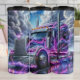 Cette image présente un semi-camion chromé très poli avec des effets éclairs bleus et violets éclatant autour et à travers son corps. Les lumières du camion brillent avec des teintes électriques assorties, et il se trouve sur une surface humide et réfléchissante sous un ciel dramatique rempli de formations nuageuses foncées et d'un patch bleu vif.
