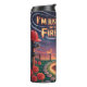 Ce graphique fantaisiste présente un coeur de feu sur une passerelle, flanqué de bornes d'incendie stylisées avec casques. La scène est un hommage romantique avec des roses rouges et un ciel brillant, avec le texte "I'M Just A WOMAN Who LOVES SON FIREFIGHTER".