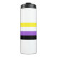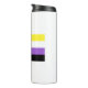 Le drapeau non-binaire a été créé en 2014 par l'activiste Kye Rowan. Chaque couleur de bande représente différents types d'identités non-binaires : Jaune pour les personnes qui s'identifient en dehors du binaire de genre, blanc pour les personnes non-binaires avec plusieurs sexes, violet pour celles avec un mélange de sexe masculin et féminin, et noir pour les individus de genre.