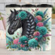 A stunning black horse is adorned with a vibrant array of teal dahlias and pink roses woven into its intricately braided mane and bridle. Lush blue hydrangeas and delicate foliage complete this breathtaking floral equine portrait, exuding elegance and a touch of fantasy.