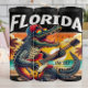 Ce graphique vibrant présente un alligator cool, portant un casquette de baseball rouge et des lunettes de soleil arc-en-ciel, déchiquetant une guitare électrique. Encadré par un coucher de soleil pittoresque sur la plage de Floride avec des palmiers et des oiseaux volants, l'audacieux texte "FLORIDA" complète ce design fantaisiste d'inspiration rock and roll, alliant parfaitement imagerie d'état iconique et flair musical.