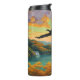 Une oie volant à la maison, au-dessus d'un fjord alors que le soleil se couche au loin, crée un beau tumeur thermique nostalgique.