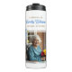 A memorial tumbler keepsake for funerals, celebration of life gatherings or to send to friends and family in honor of someone they lost. You can add a photo in the personalized area. The accent colors used are blue and gold. There is a golden cross with blue flowers on it too.