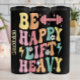 Ce graphique joyeux présente le texte de motivation 'BE HAPPY LIFT HEAVY', conçu dans un style rétro avec de grandes lettres mousseuses. Le design coloré comprend des fleurs stylisées et des boulons éclair, créant une déclaration positive, amusante et optimisée pour une séance d'entraînement heureuse.