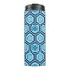 Tumbler dans une impression kimono japonaise classique - Hexagons de nidification avec un motif de fleur central dans bleu marine foncé / indigo, blanc et bleu denim moyen sur un bleu ciel clair arrière - plan