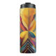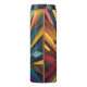 Au centre, convergent un ensemble dynamique de formes géométriques et audacieuses, formant une composition symétrique et colorée. La pièce utilise une variété de teintes, allant des jaunes chauds et des oranges aux bleus et violets cool.