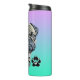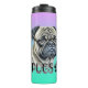 Carlin mignon et empreinte de patte, j'adore Carlins bouteille d'eau. L'art de l'Ai dépeint un Carlin mignon. Un cadeau sucré pour les propriétaires de chiens ou les amateurs de Carlins. Arrière - plan violet et turquoise.