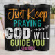 This encouraging design states "Just Keep PRAYING GOD Will GUIDE YOU." "Just Keep" is in orange script, "PRAYING" is in a distressed teal, and "GOD" is bold and textured white. "Will GUIDE YOU" is in a vibrant green, with an arrow symbol, conveying a message of continuous prayer and divine direction.