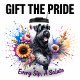 Un Terrier Russe Noir fort et heureux avec une bouche ouverte et une langue visible est énergiquement posé au milieu d'un arrangement dynamique mais quelque peu muet de tournesols, pivoines roses et fleurs sauvages violets. Les éclaboussures d'aquarelle bleu et violet apportent une touche dynamique à ce portrait canin puissant.