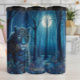 Cette illustration enchanteresse représente un léopard aux yeux bleus, partiellement caché dans la sous-bois d'une forêt magique la nuit. Une grande et brillante pleine lune illumine la scène à travers les branches nues des grands arbres, jetant de longues ombres et mettant en évidence les détails complexes de la forêt et la fourrure à motifs du léopard. La palette de couleurs est principalement dans les tons bleus, créant une atmosphère sereine et mystique.