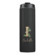 Élégant tumeur thermique noire avec un monogramme botanique en or au centre.