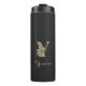 Élégant tumeur thermique noire avec un monogramme botanique en or au centre.