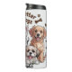Cette illustration graphique présente un groupe de six races de chiens heureuses et diverses, dont un Husky, un Chihuahua, un Golden Retriever et un Shih Tzu. Ils sont tous assis ensemble, souriant avec leur langue. Le texte "La vie est meilleure avec les chiens" est écrit dans une police amusante et audacieuse au-dessus d'eux, entourée d'empreintes de pattes et d'os, créant une esthétique joyeuse et ludique.