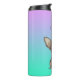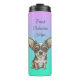 Illustration d'un chien Chihuahua mignon avec de grands yeux. La citation au dos de la tasse indique "Maman fière de Chihuahua", mais vous pouvez la personnaliser pour dire ce que vous voulez. Dégradé de violet à sarcelle.