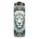 Cette image présente une magnifique oeuvre d'art représentant au centre un majestueux visage de lion. La crinière du lion est minutieusement détaillée avec des lignes fluides et ondulées dans les tons blanc et gris, dégageant une aura d'élégance royale. Autour du lion sont des motifs fleuris et mandala en or et blanc, dressés contre un riche arrière - plan bleu profond. Ces motifs complexes ajoutent profondeur et complexité à l'oeuvre, la rendant visuellement captivante. L'accent central mis sur le lion, combiné avec les motifs ornés, crée une pièce harmonieuse et artistiquement significative qui attirera l'admiration.