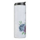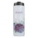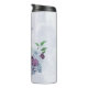 Magnifique tumbler thermique romantique avec des fleurs bleues poussiéreuses et violettes et quelques feuilles vertes .
