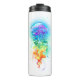 Grande méduse irisée, artistiquement dessinée, brillante, avec de longues tentacules sur le blanc, peinte sur l'arrière - plan multicolore. Méduse arc-en-ciel.