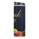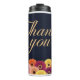 Un joli "Merci" écrit à la main en caractères gras et fluides occupe le centre de l'image. Sous le texte, un délicat arrangement de fleurs élégantes dans des tons pastel doux encadre le message, créant une composition visuellement attrayante et chaleureuse.