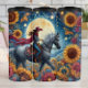 Cette image représente une cowgirl avec un foulard rouge qui coule à cheval à travers un champ vibrant et capricieux de tournesols et de roses surdimensionnés. Une grande lune lumineuse illumine l'arrière - plan, entourée d'étoiles scintillantes et d'un ciel bleu complexe. Le cheval est orné d'une couverture de selle colorée à motifs, ajoutant à l'atmosphère magique.