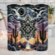Cette illustration stylisée présente en son centre une grande étoile de type mandala brillante avec des motifs complexes. L'arrière - plan est un ciel nocturne avec des nuages stylisés, des yeux et des formes cosmiques en violet et orange. Au premier plan, des silhouettes noires de cactus saguaro, une petite tente et un feu de camp complètent la scène mystique du désert, mêlant motifs tribaux et spirituels.