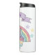 Ce chausson à boisson personnalisée, mignon et coloré, présente une belle illustration d'un arc-en-ciel couleur unicorne et pastel. De petites étoiles aux couleurs assorties entourent l'arc-en-ciel. Une bannière est imprimée au-dessus de la licorne avec un exemple de nom imprimé ci-dessous dans une police de caractères violets élégante. Vous pouvez personnaliser le tumbler pour inclure votre propre nom ou texte personnalisé.