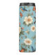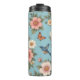 C'est une bouteille d'eau avec un arrière - plan bleu clair avec des fleurs, des oiseaux et des papillons.