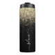 monogramme personnalisé avec prénom dans un style de signature fantaisie sur tumbler thermique à paillettes or noir.