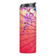 Un parasol rose et rouge décoré de fleurs peintes et de petits oiseaux bleus. Il semble briller de l'intérieur.
