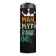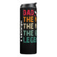 Ce graphique présente un design de style vintage pour un passionné de bowling. Il comprend trois épingles de bowling et le texte 'DAD. L'HOMME. LE MYTHE. LA LÉGENDE DE BOWLING.' en polices empilées, multicolores avec un look déprimé. C'est un graphisme amusant et festif parfait pour un père qui aime bowl.
