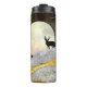 Un paysage Abstrait dans des tons éclatants d'argent, d'or et de rouge avec une lune, des étoiles et un cerf.