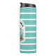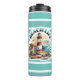Bouteille d'eau thermale Beach Life. Illustration d'une scène de plage avec phare, planches de surf, palmiers et dauphin.