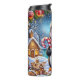 Cette charmante illustration présente un mignon pingouin moelleux portant un chapeau de Père Noël et un foulard rayé. Le pingouin tient un sucre de canne et une tasse de cacao chaud dans un merveilleux pays d'hiver magique avec des maisons en pain d'épices et des arbres de Noël décorés, créant une scène de vacances cosy et adorable.