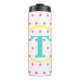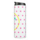 Joli pois rose sur arrière - plan blanc. Personnalisez avec votre initiale monogrammée en texte turquoise au centre du cercle bleu jaune. Des cercles géométriques frais et tendance sur des tumblers pour votre style unique. Amusant pour tous ceux qui aiment les points. Conception originale © TamiraZDesigns. www.zazzle.com/tamirazdesigns