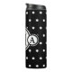Pois blancs monogrammés élégants sur des tumeurs arrière - plans noires. Personnalisez avec le nom initial dans le cercle central, le prénom initial dans le cercle gauche, le deuxième nom initial dans le cercle droit. Des cercles géométriques frais et tendance sur des tumblers pour votre style unique. Visitez mon magasin pour les accessoires correspondants. Oeuvres d'art originales © TamiraZDesigns.