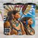 Ce portrait audacieux et aux couleurs vives présente deux personnages amérindiens, peut-être des guerriers ou des chasseurs, côte à côte. Les deux personnages portent des coiffes en plumes élaborées et des bijoux traditionnels complexes. Le style artistique est peint et très stylisé, en utilisant des couleurs saturées contre un ciel bleu vif. Cette puissante illustration décorative célèbre la culture, le patrimoine et la force, en véhiculant un sentiment de fierté et de tradition dans une esthétique saisissante.