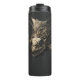 "A stainless steel thermal travel tumbler featuring a highly detailed illustration of a deep-sea anglerfish skull. The striking bone-white and tan skull showcases a dramatic mohawk-like crest of bony fins, a large empty eye socket, and sharp interlocking teeth, surrounded by artistic dark ink splatters. This insulated travel mug is perfect for keeping beverages hot or cold. An edgy, macabre, and gothic nautical accessory for daily commutes, outdoor adventures, or gaming. High-quality wraparound print."