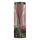 A gorgeous tumbler with an ai illustration of a beautiful pink feathered dreamcatcher hanging in the window with a shelf of pink and white potted flowers under it, overlooking a yard full of Lucius green trees.