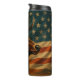 Un wapiti majestueux aux bois impressionnants est représenté en profil, son regard orienté vers la droite. Derrière l'élan se déploie un drapeau américain de premier plan, avec ses étoiles et ses rayures qui créent une toile de fond patriotique. Le style artistique associe la faune naturelle à un symbolisme national, évoquant un sentiment de fierté et de liberté sauvage.