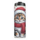 This is a delightful and cozy Christmas illustration designed as a framed vignette, perfect for a tumbler or seasonal product. The central subject is an incredibly adorable, fluffy kitten (with tabby markings) featuring large, expressive eyes.