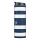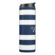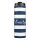 Stripes Bleues Modernes Script Paruline Thermique. Boulon thermique avec un motif à rayures bleues et blanches audacieuses et imprimé de nom personnalisé. Tapez votre nom dans le champ modèle pour le personnaliser. Dîner et accessoires de cuisine correspondants disponibles.