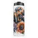 Un Bloodhound digne avec une expression douce et sa langue légèrement dehors est paisiblement situé au milieu d'un bel agencement de tournesols aux tons chauds et de grandes pivoines violettes. De subtiles plaques d'aquarelle dans l'arrière - plan ajoutent une touche artistique et apaisante à ce portrait canin doux.